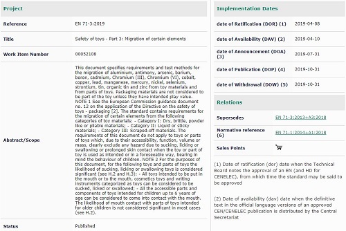 EN 71-3:2019將被賦予歐盟各國國家標(biāo)準(zhǔn)的地位,并且與其沖突的國家標(biāo)準(zhǔn)將最晚在2019年10月31日前被取代。