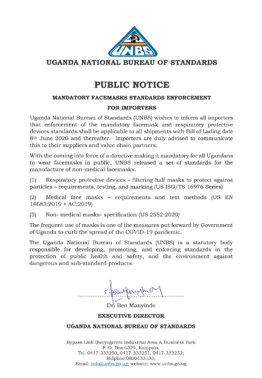 烏干達國家標(biāo)準(zhǔn)局 UNBS(Uganda National Bureau of Standards)最新公告, 為了保護公眾健康和安全,從2020年6月8日(提單日期)起,口罩和呼吸防護設(shè)備出口至烏干達需要強制執(zhí)行如下標(biāo)準(zhǔn):