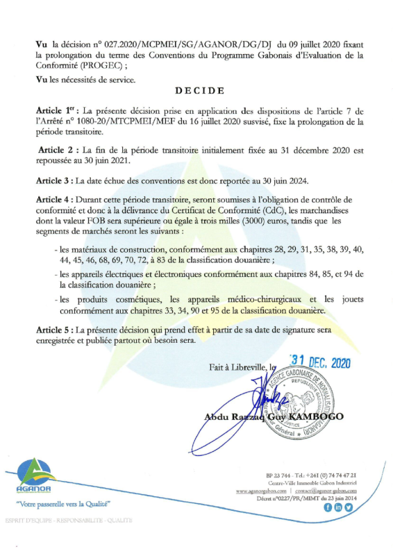 近日,加蓬標(biāo)準(zhǔn)化機(jī)構(gòu) AGANOR (Agence Gabonaise de Normalisation) 再次發(fā)布了最新公告,為了能促進(jìn)更多人理解并更好地執(zhí)行該方案,決定將新法令執(zhí)行過渡期再推遲至2021年6月30日。
