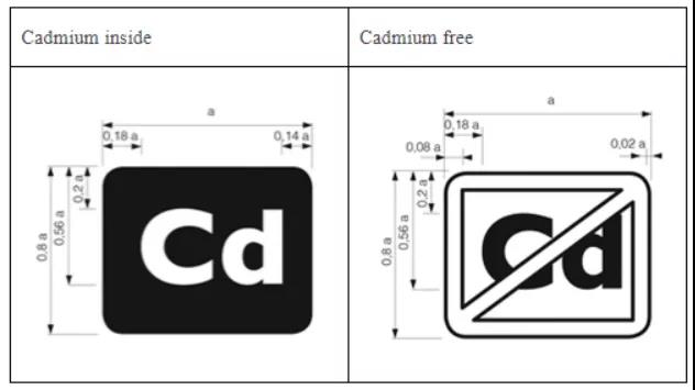 帶有屏幕面板的電子顯示器中,如有均質(zhì)材料中鎘(Cd)含量超過2011/65/EU指令中規(guī)定的0.01wt%,應(yīng)張貼“Cadmium inside”標(biāo)識;如所有均值材料均不超過,應(yīng)張貼“Cadmium free”標(biāo)識。標(biāo)識應(yīng)清晰、耐用、易讀且不可磨滅。標(biāo)志應(yīng)牢固地連接在顯示面板內(nèi)部,或壓模在一個明顯的位置,一旦背面外殼被移除,工人就可以看到這個標(biāo)識。標(biāo)識應(yīng)采用下列圖形形式:
