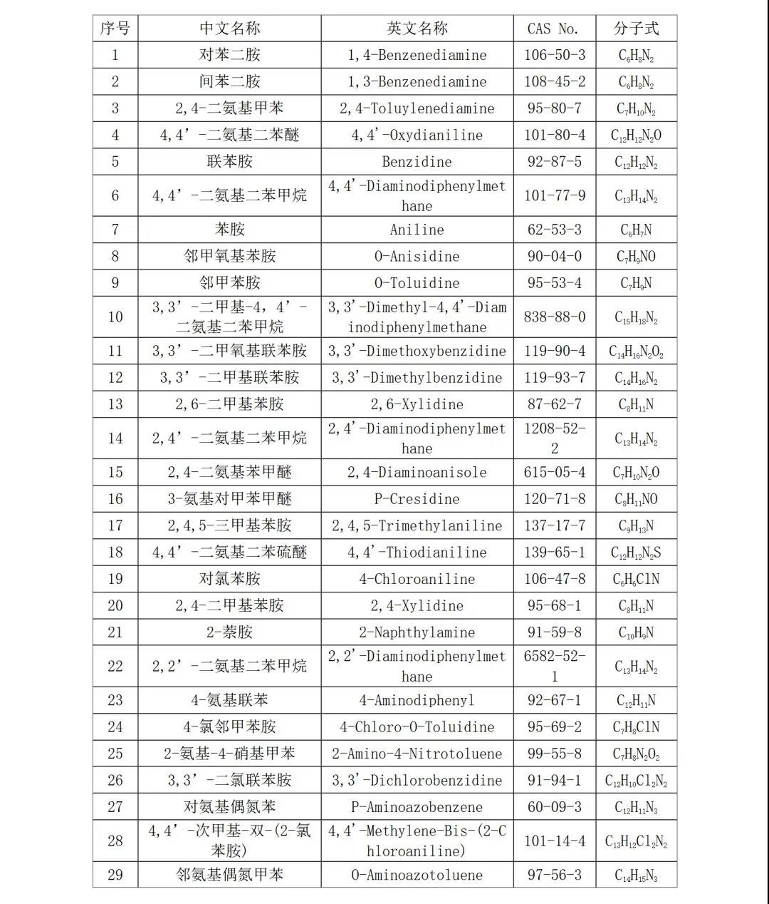 標(biāo)準(zhǔn)規(guī)定了食品接觸材料及制品中29種芳香族伯胺遷移量的測(cè)定方法。下圖為29種芳香族伯胺的名稱、CAS號(hào)以及分子式。