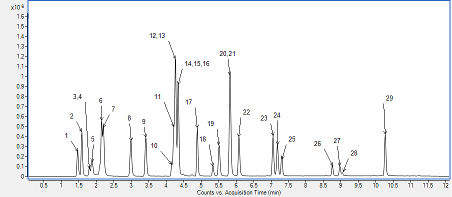 29種芳香族伯胺在液相色譜-串聯(lián)質(zhì)譜中的總離子流色譜圖