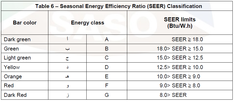 SEER的計(jì)算方法依據(jù) SASO ISO 16358-1:2013, Clause 6 和 ISO 16358-1:2013/AMD 1:2019,能效等級判定如下: