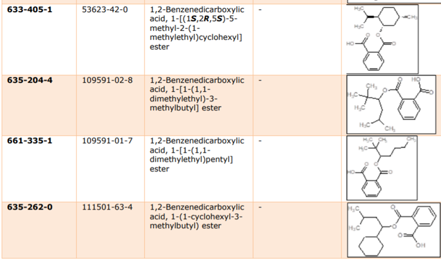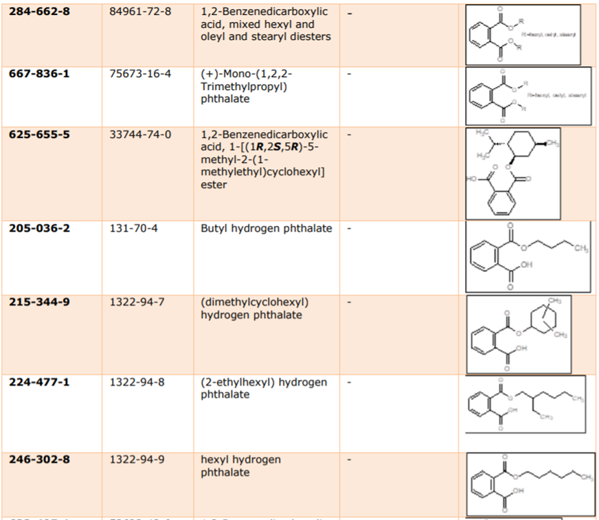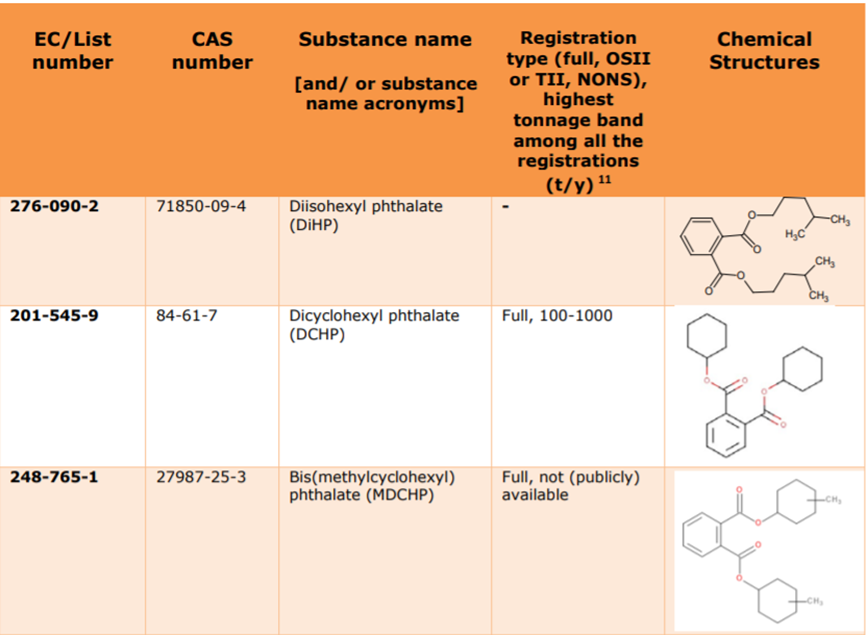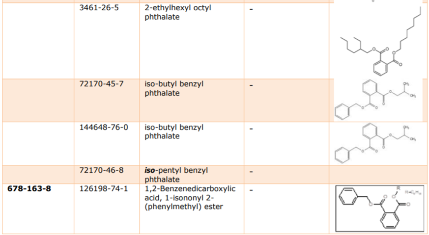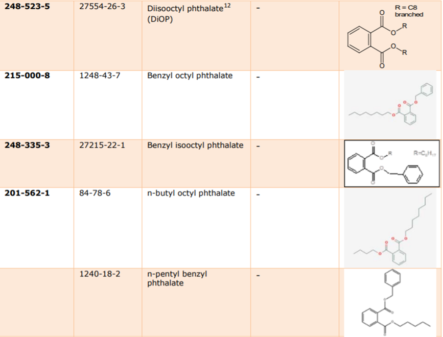 目前,ECHA尚未收到任何有關這些物質(zhì)的授權(使用)申請,這表明它們在歐盟消費產(chǎn)品中的使用已基本被淘汰。基于REACH第7(2)條款要求的物品中物質(zhì)(substances in articles,SiA)的SVHC通知義務方面也未收到任何通知。 履行廢棄物框架指令的SCIP數(shù)據(jù)庫顯示,(除異戊基戊基鄰苯二甲酸酯n-pentyl-isopentylphthalate外)都在進口歐盟的物品中含有,且每個進口商每年度進口的量可能不到一噸。