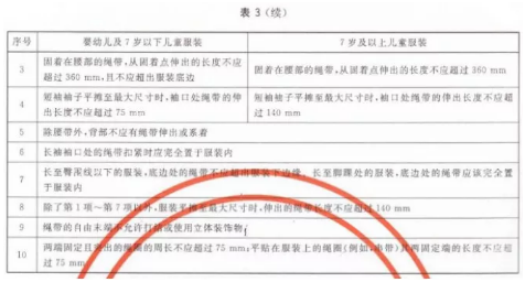 3 | 機械安全 | 標(biāo)準(zhǔn)對兒童服裝頭頸、肩部、腰部等不同部位繩帶作出詳細(xì)規(guī)定,要求嬰幼兒及7 歲以下兒童服裝頭頸部不允許存在任何繩帶; 標(biāo)準(zhǔn)對紡織附件也做出了規(guī)定,要求附件應(yīng)具有一定的抗拉強力,且不應(yīng)存在銳利尖端和邊緣。 |